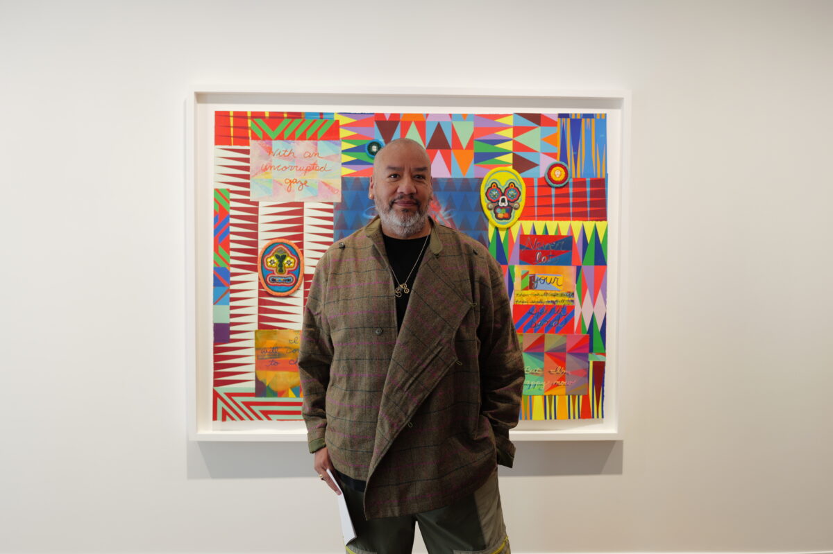 Sous les voûtes claires de la galerie Hauser & Wirth, au 26 bis rue François-1er, les œuvres de Jeffrey Gibson semblent respirer. L’artiste américano-choctaw, figure majeure de la scène contemporaine, y présente sa première exposition solo en France : This is dedicated to the one I love – un titre comme une offrande, ou un souffle d’empathie adressé au monde.
