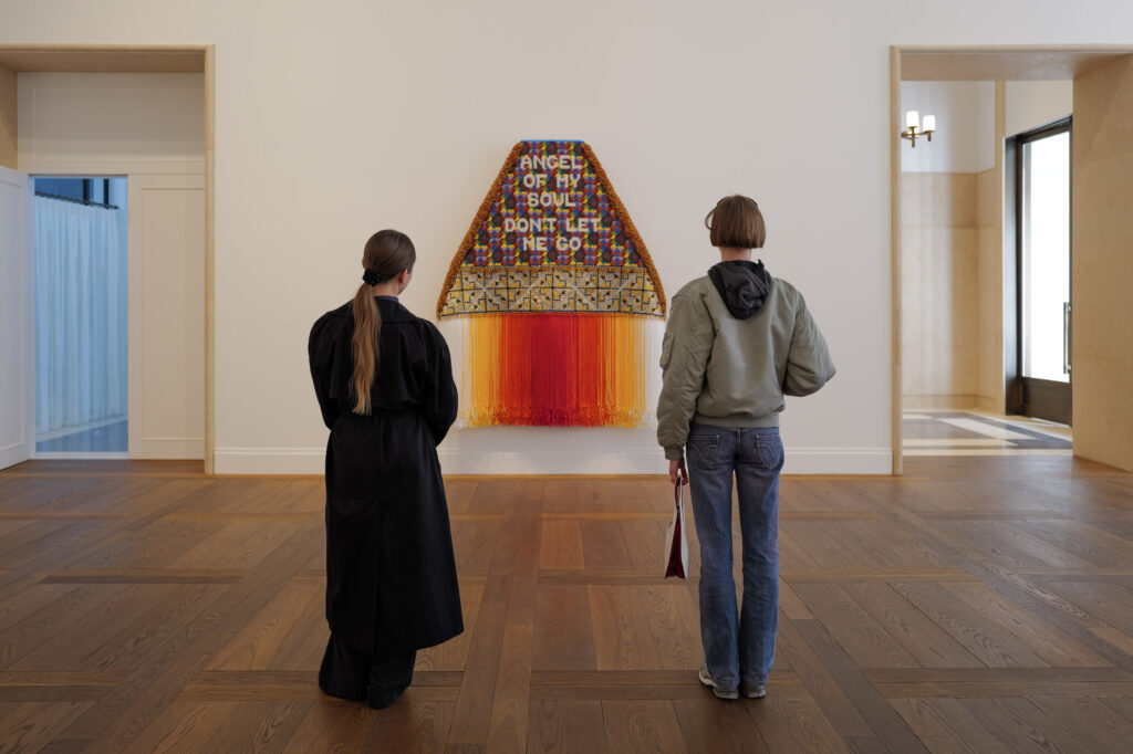 Depuis plus de trente ans, Jeffrey Gibson mêle l’histoire autochtone, la culture queer et la mémoire populaire américaine pour inventer un langage visuel où la couleur devient matière spirituelle. Ici, les toiles, les perles et les céramiques forment un paysage où tout vibre. Ses « punching bags » suspendus, gainés de franges et d’inscriptions comme Never let your spirit bend, remplacent le corps, le transcendent. On aurait presque envie d’y cogner, pour sentir la résonance des perles — mais sans gants, on s’abstiendra.